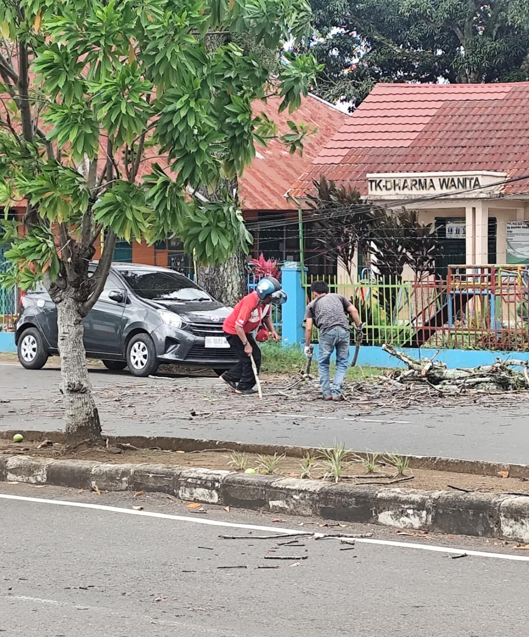 Melihat kondisi yang berpotensi menimbulkan kemacetan, warga yang mengetahui hal ini bergerak cepat dengan bergotong royong membersihkan ranting pohon yang menutupi jalan tersebut.