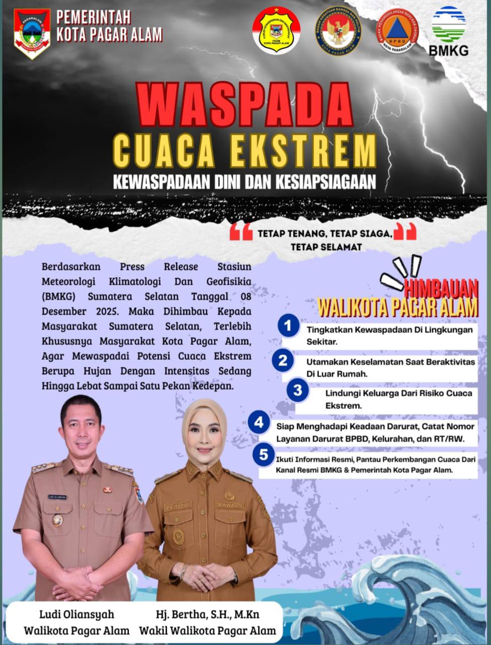 Hal ini disampaikan Wali Kota Pagar Alam, Ludi Oliansyah, menyusul rilis resmi dari BMKG Sumatera Selatan tanggal 8 Desember 2025.